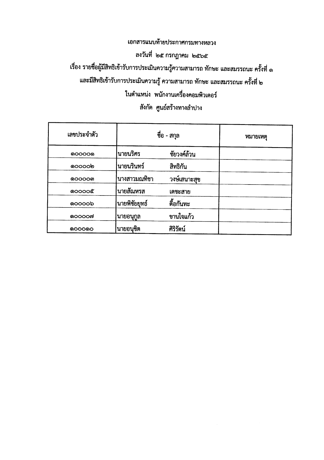 ประกาศรายชื่อผู้ผ่านการประเมินสมรรถนะ ครั้งที่ 1 และมีสิทธิ์เข้ารับการประเมินสมรรถนะ ครั้งที่ 2 ในตำแหน่ง พนักงานเครื่องคอมพิวเตอร์