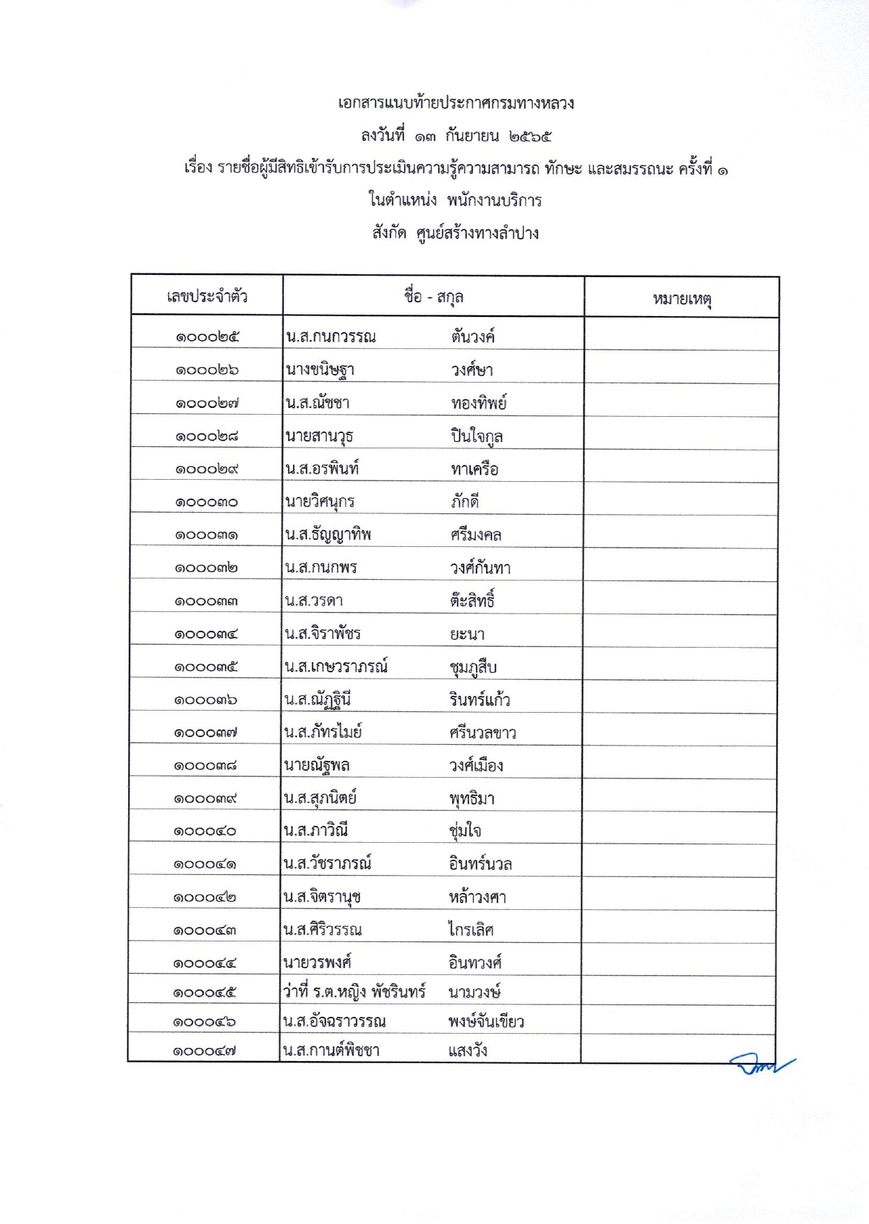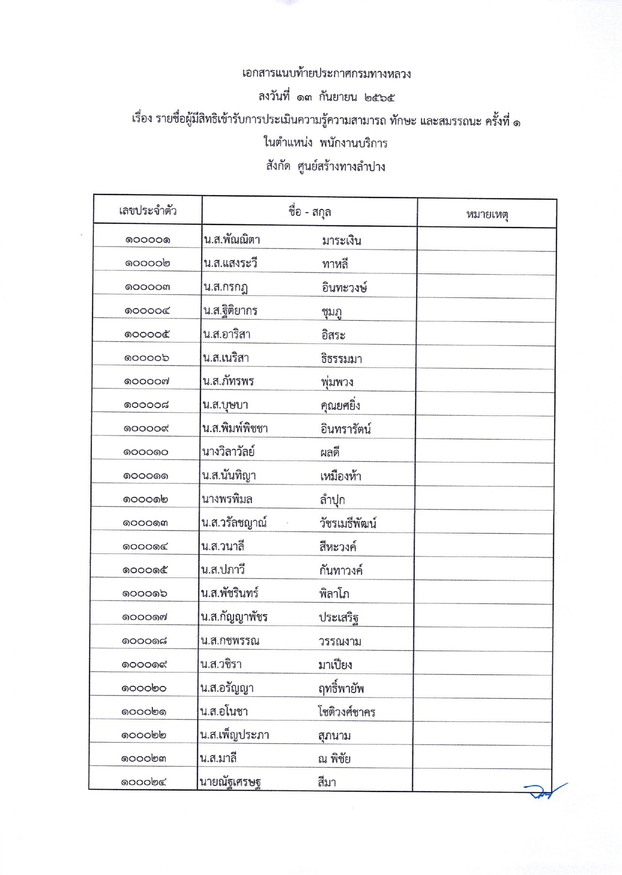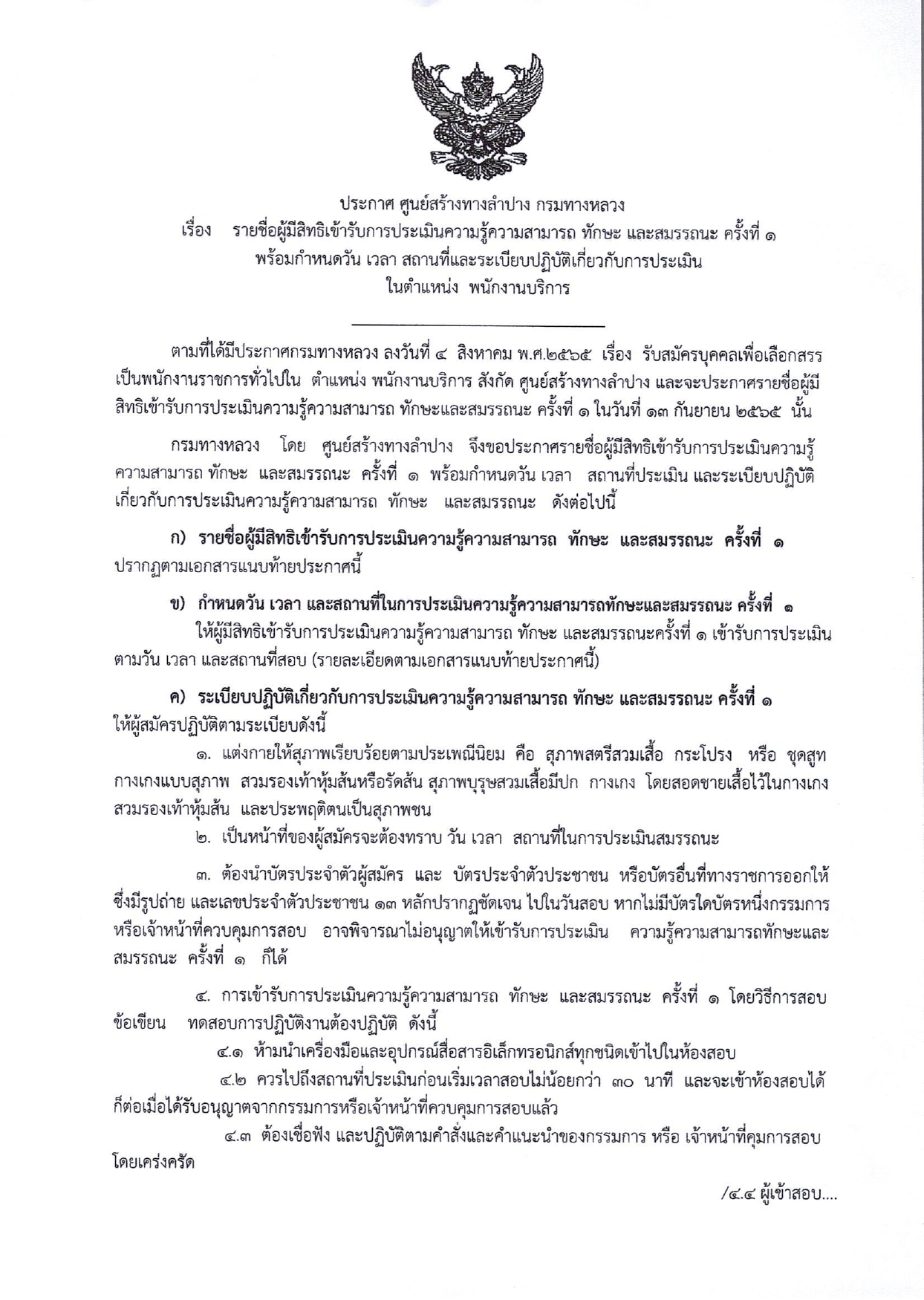 ประกาศรายชื่อผู้มีสิทธ์เข้ารับการประเมินสมรรถนะครั้งที่ 1 กำหนดวันและสถานที่ประเมินสมรรถนะเพื่อเลือกสรรเป็นพนักงานราชการทั่วไป ตำแหน่งพนักงานบริการ