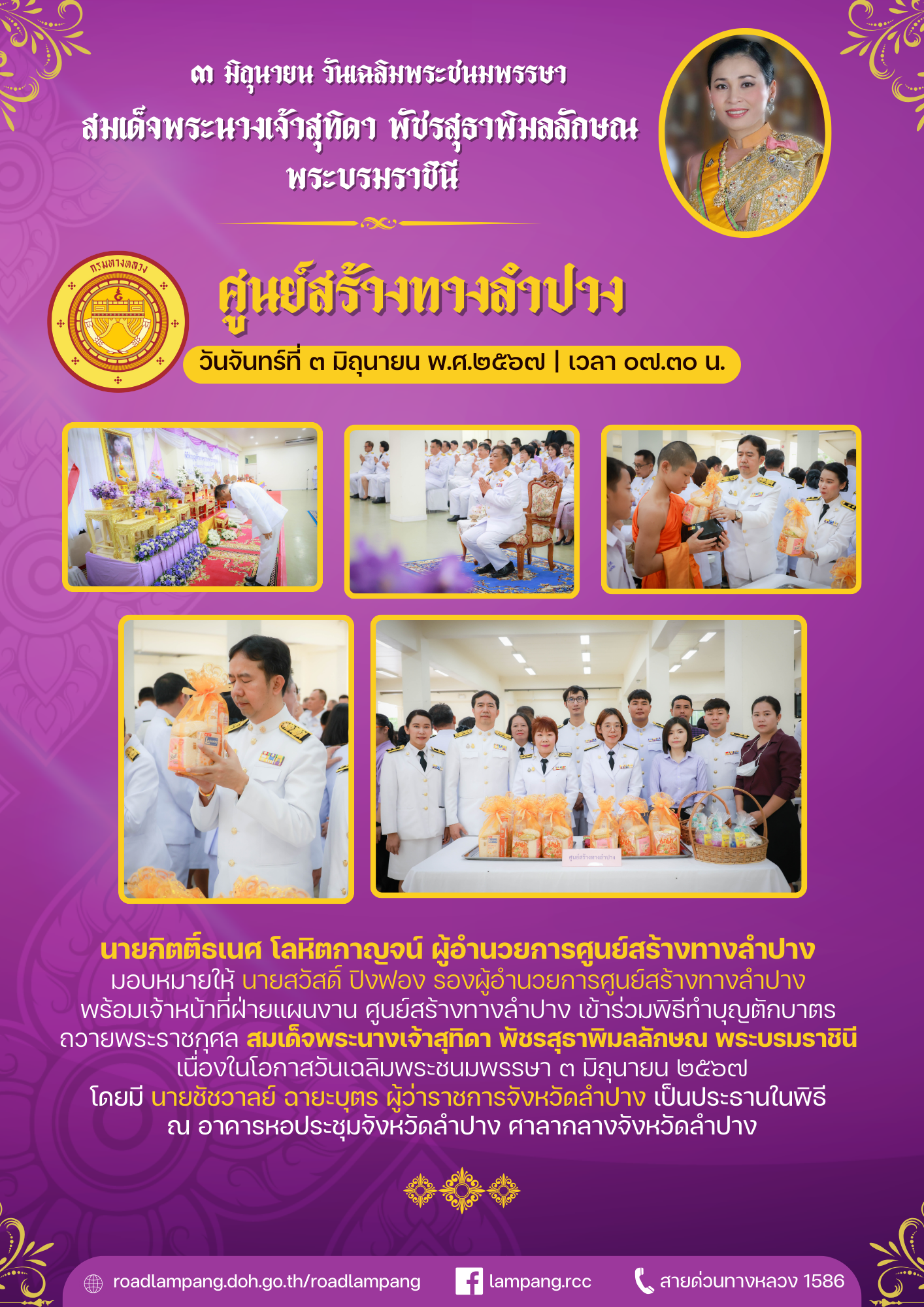 นายกิตติ์ธเนศ โลหิตกาญจน์ ผู้อำนวยการศูนย์สร้างทางลำปาง มอบหมายให้ นายสวัสดิ์ ปิงฟอง รองผู้อำนวยการศูนย์สร้างทางลำปาง พร้อมเจ้าหน้าที่ฝ่ายแผนงาน ศูนย์สร้างทางลำปาง เข้าร่วมพิธีทำบุญตักบาตรถวายพระราชกุศล สมเด็จพระนางเจ้าสุทิดา พัชรสุธาพิมลลักษณ พระบรมราชินี เนื่องในโอกาสวันเฉลิมพระชนมพรรษา ๓ มิถุนายน ๒๕๖๗ โดยมี นายชัชวาลย์ ฉายะบุตร ผู้ว่าราชการจังหวัดลำปาง เป็นประธานในพิธี ณ อาคารหอประชุมจังหวัดลำปาง ศาลากลางจังหวัดลำปาง