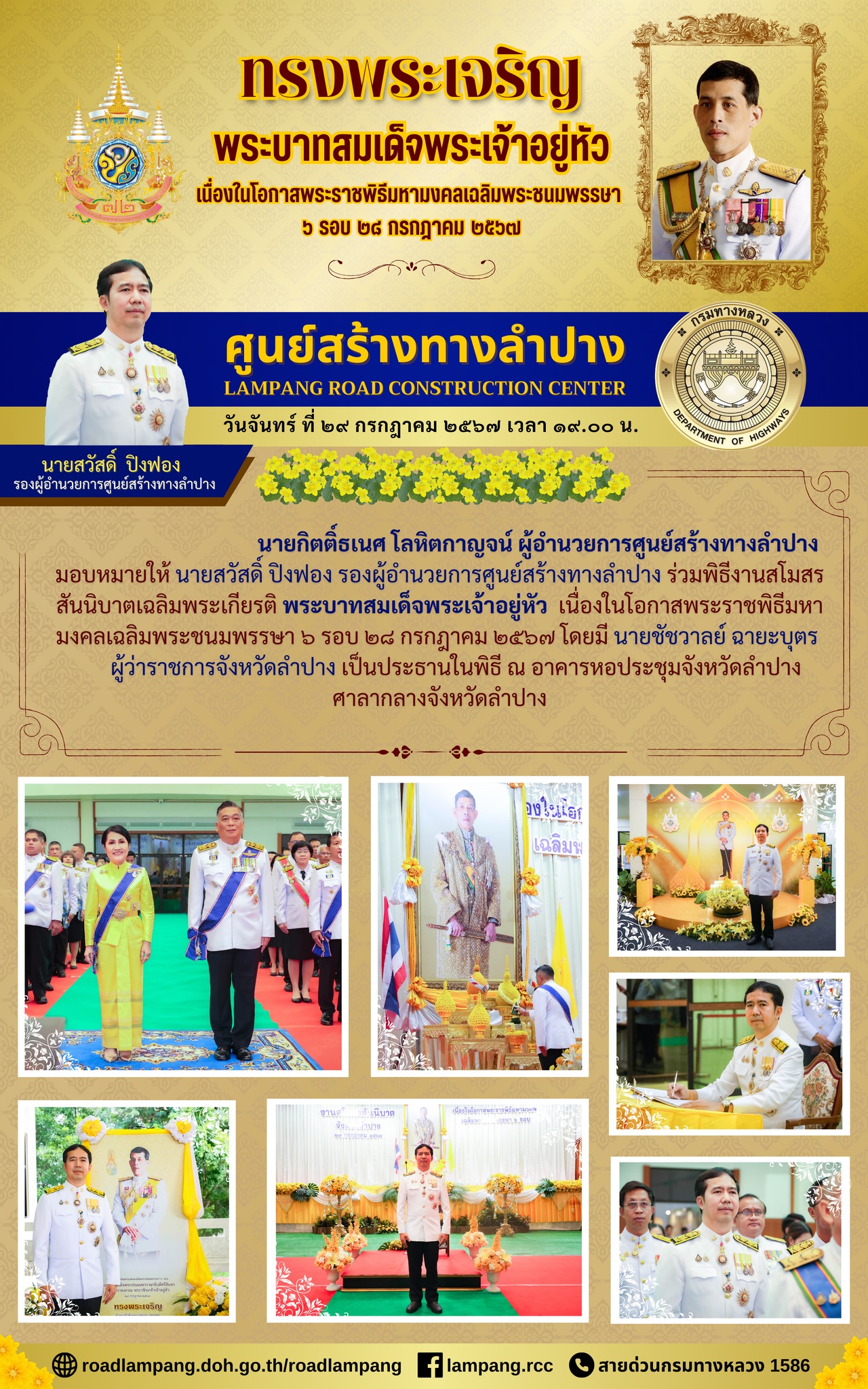 นายกิตติ์ธเนศ โลหิตกาญจน์ ผู้อำนวยการศูนย์สร้างทางลำปาง มอบหมายให้ นายสวัสดิ์ ปิงฟอง รองผู้อำนวยการศูนย์สร้างทางลำปาง ร่วมพิธีงานสโมสรสันนิบาตเฉลิมพระเกียรติ พระบาทสมเด็จพระเจ้าอยู่หัว เนื่องในโอกาสพระราชพิธีมหามงคลเฉลิมพระชนมพรรษา ๖ รอบ ๒๘ กรกฎาคม ๒๕๖๗ โดยมี นายชัชวาลย์ ฉายะบุตร ผู้ว่าราชการจังหวัดลำปาง เป็นประธานในพิธี ณ อาคารหอประชุมจังหวัดลำปาง ศาลากลางจังหวัดลำปาง