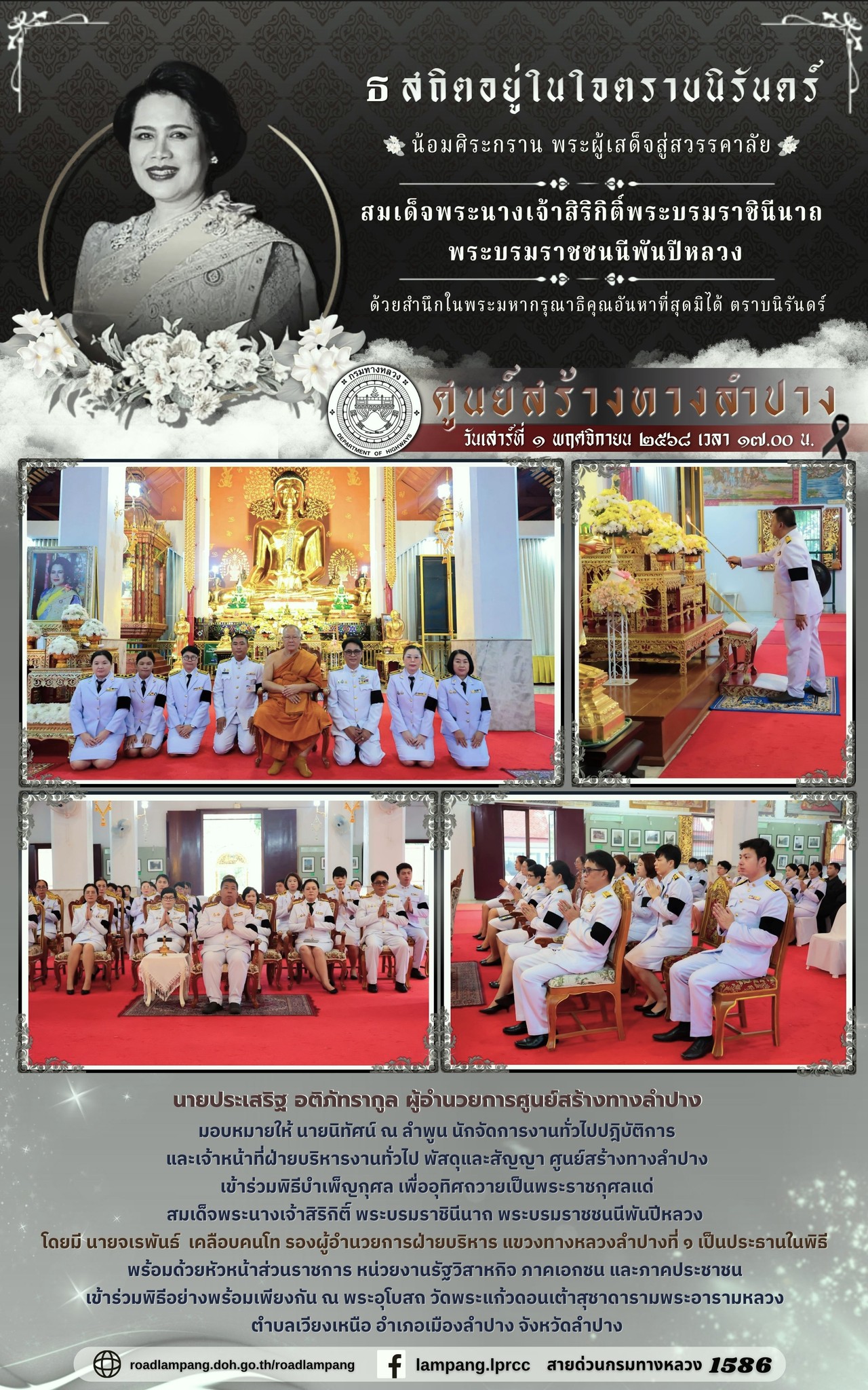 นายประเสริฐ อติภัทรากูล ผู้อำนวยการศูนย์สร้างทางลำปาง มอบหมายให้ นายนิทัศน์ ณ ลำพูน นักจัดการงานทั่วไปปฎิบัติการ และเจ้าหน้าที่ฝ่ายบริหารงานทั่วไป พัสดุและสัญญา ศูนย์สร้างทางลำปา'เข้าร่วมพิธีบำเพ็ญกุศล เพื่ออุทิศถวายเป็นพระราชกุศลแด่ สมเด็จพระนางเจ้าสิริกิติ์ พระบรมราชินีนาถ พระบรมราชชนนีพันปีหลวง