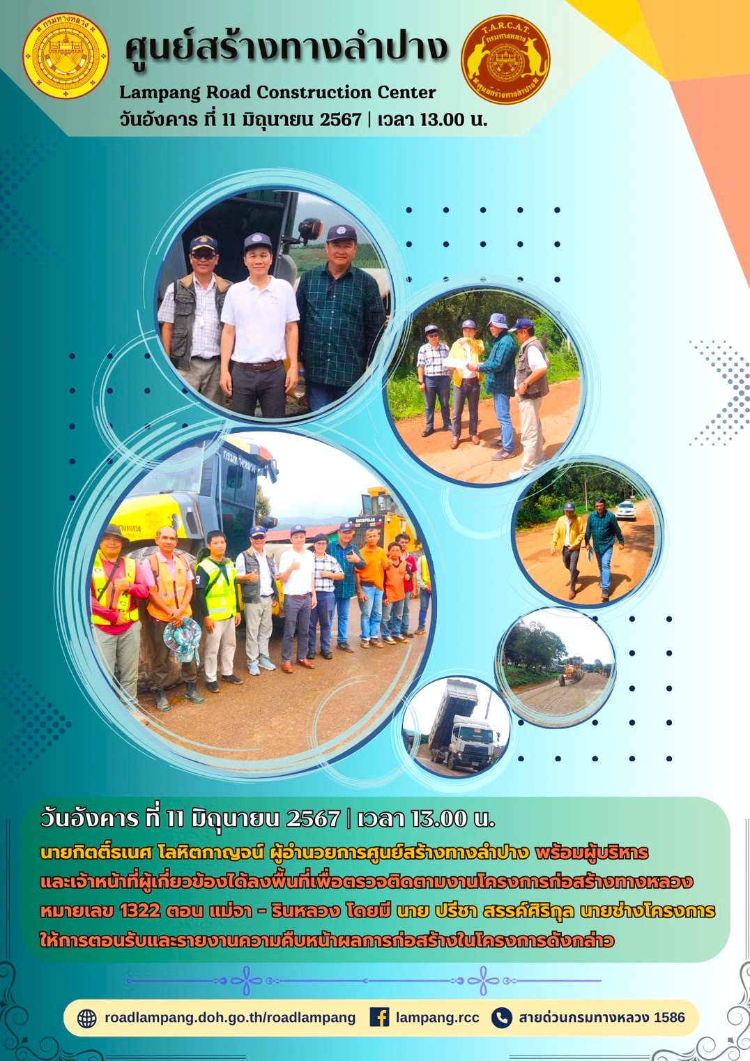 นายกิตติ์ธเนศ โลหิตกาญจน์ ผู้อำนวยการศูนย์สร้างทางลำปาง พร้อมผู้บริหาร และเจ้าหน้าที่ผู้เกี่ยวข้องได้ลงพื้นที่เพื่อตรวจติดตามงานโครงการก่อสร้างทางหลวง หมายเลข 1322 ตอน แม่จา - รินหลวง โดยมี นาย ปรีชา สรรค์ศิริกุล นายช่างโครงการ ให้การตอนรับและรายงานความคืบหน้าผลการก่อสร้างในโครงการดังกล่าว