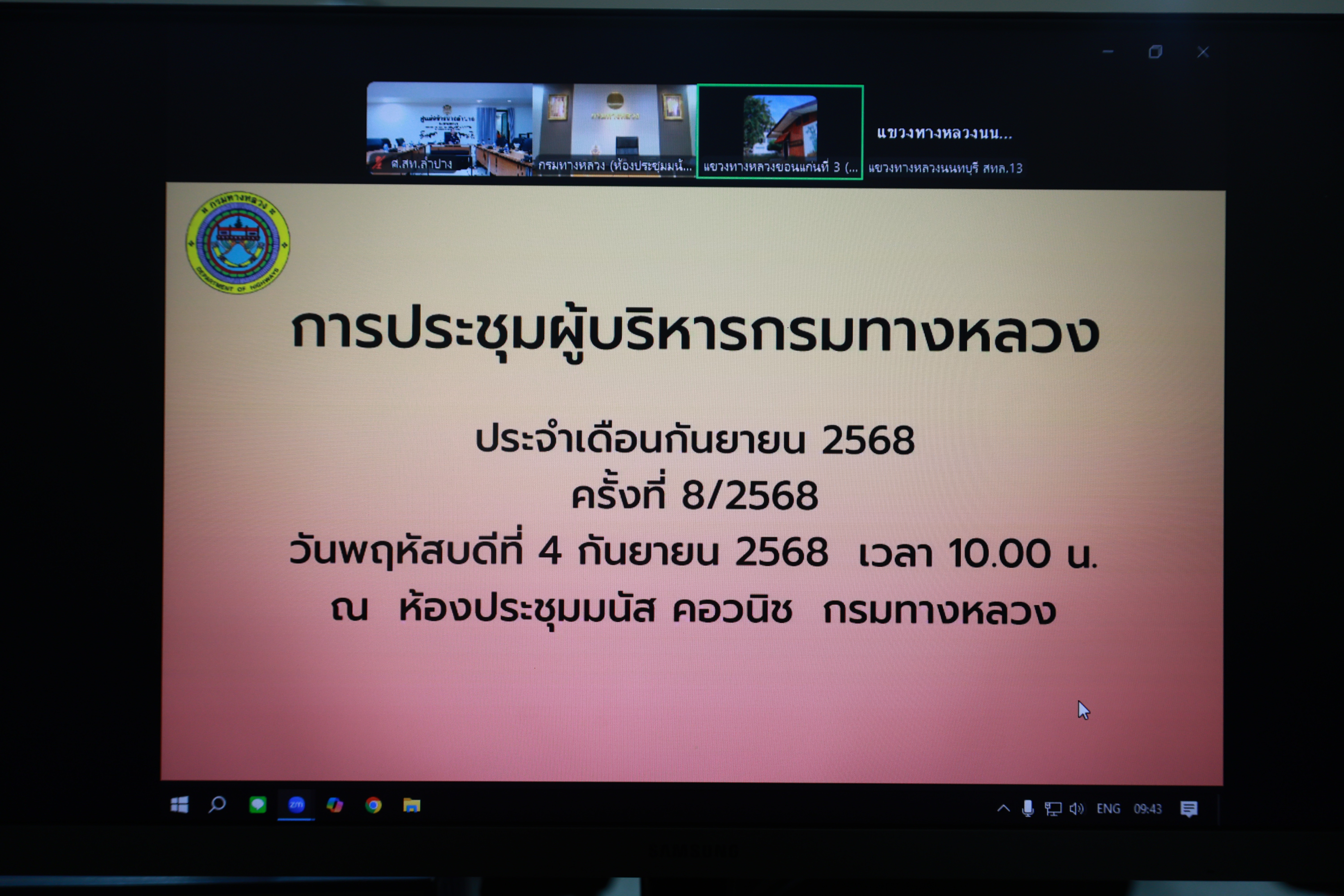 พร้อมคณะผู้บริหาร และเจ้าหน้าที่ที่เกี่ยวข้อง เข้าร่วมประชุมผู้บริหาร กรมทางหลวง ประจำเดือน กันยายน 2568 ครั้งที่ 8/2568 โดยมี นายอภิรัฐ ไชยวงศ์น้อย อธิบดีกรมทางหลวง เป็นประธานในการประชุม ผ่านระบบ Zoom Cloud Meeting ณ ห้องประชุมอาลัมพางค์ อาคารกุกกุฎนคร ศูนย์สร้างทางลำปาง