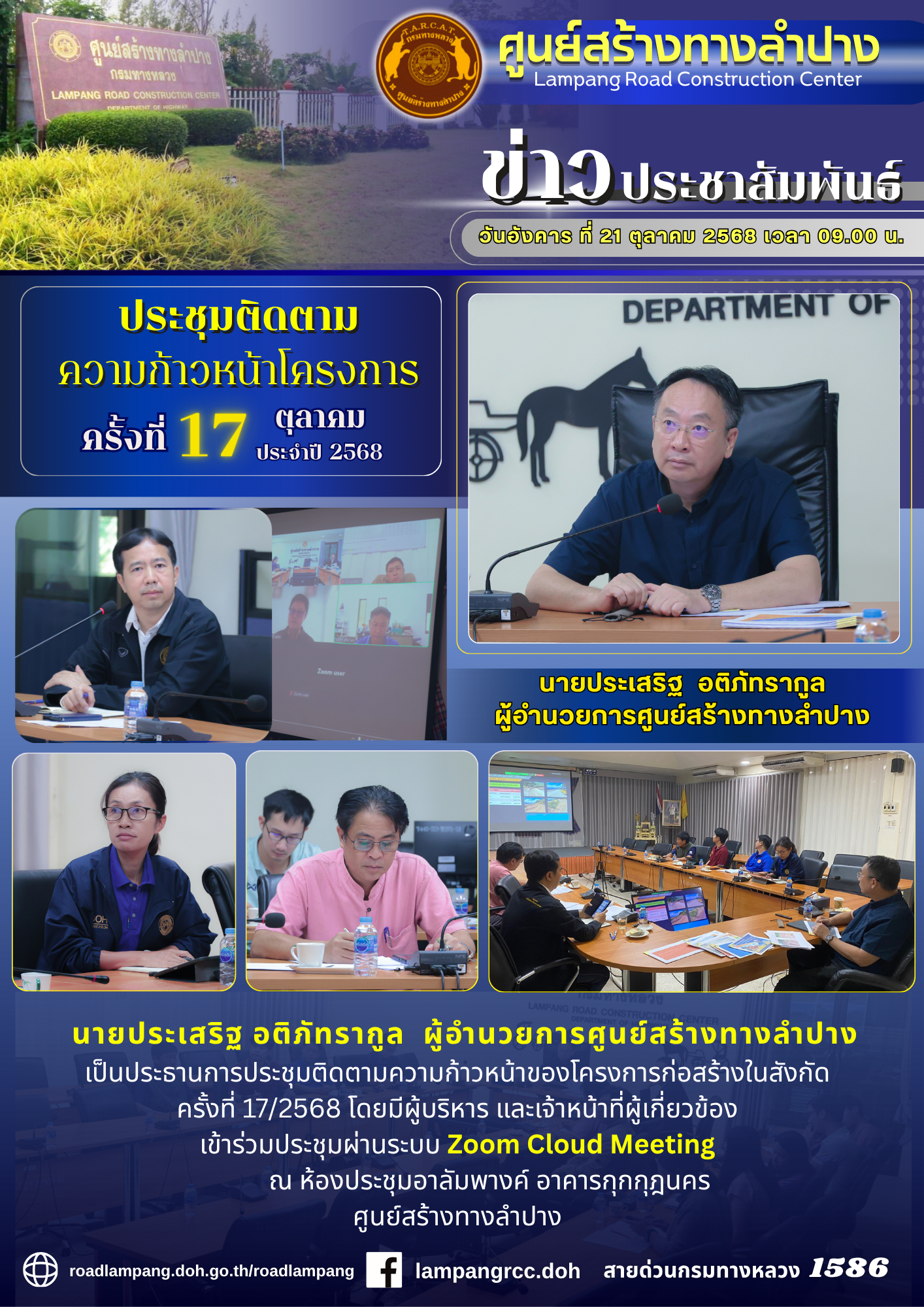 นายประเสริฐ อติภัทรากูล ผู้อำนวยการศูนย์สร้างทางลำปาง เป็นประธานการประชุมติดตามความก้าวหน้าของโครงการก่อสร้างในสังกัด ครั้งที่ 17/2568