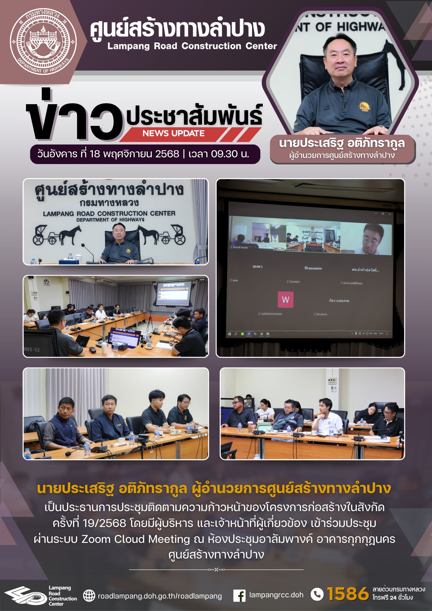 นายประเสริฐ อติภัทรากูล ผู้อำนวยการศูนย์สร้างทางลำปาง เป็นประธานการประชุมติดตามความก้าวหน้าของโครงการก่อสร้างในสังกัด ครั้งที่ 19/2568 โดยมีผู้บริหาร และเจ้าหน้าที่ผู้เกี่ยวข้อง เข้าร่วมประชุม ผ่านระบบ Zoom Cloud Meeting ณ ห้องประชุมอาลัมพางค์ อาคารกุกกุฎนคร ศูนย์สร้างทางลำปาง